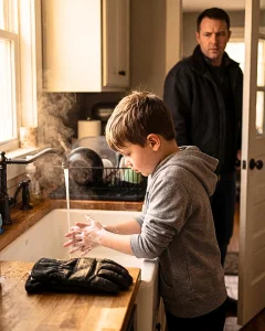 Nolan stood at the sink with his head lowered, shoulders bare, the gloves lying on the counter for the first time since he’d arrived. He was scrubbing his hands with a force that made my chest tighten. Water poured over skin that looked wrong—too red, too raw. Angry lines crossed his palms and wrists as if something had been pressed there over and over.