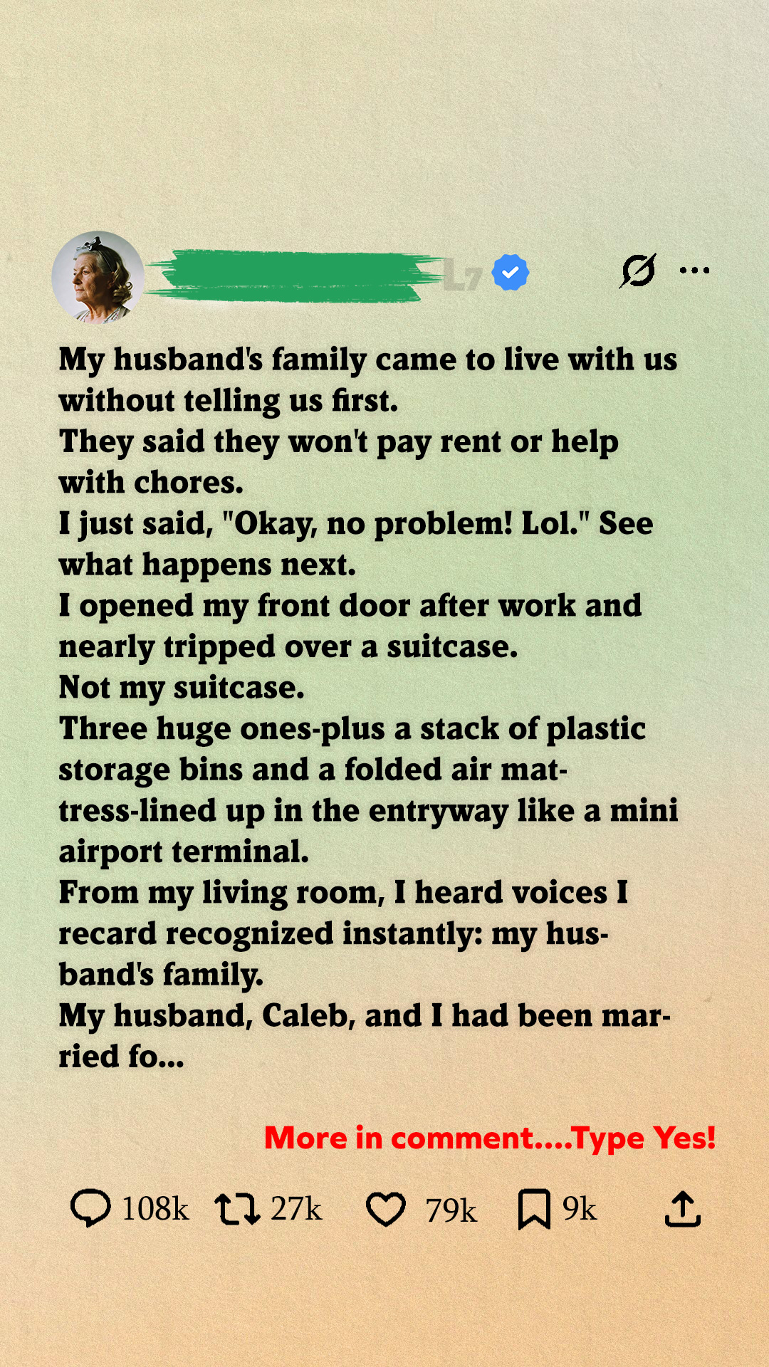 Apparently, his family didn’t get that memo. I stepped into the living room and there they were. Caleb’s mother sat comfortably on our couch like she owned the place. His younger brother was scrolling on his phone, shoes on my coffee table. And his aunt was opening cabinets in the kitchen.