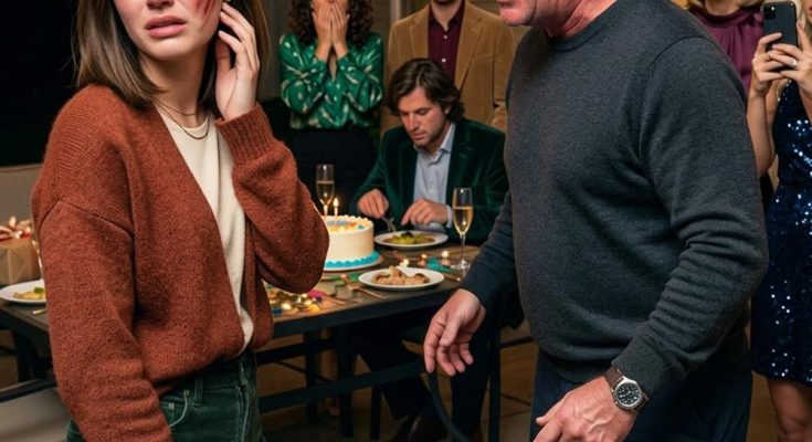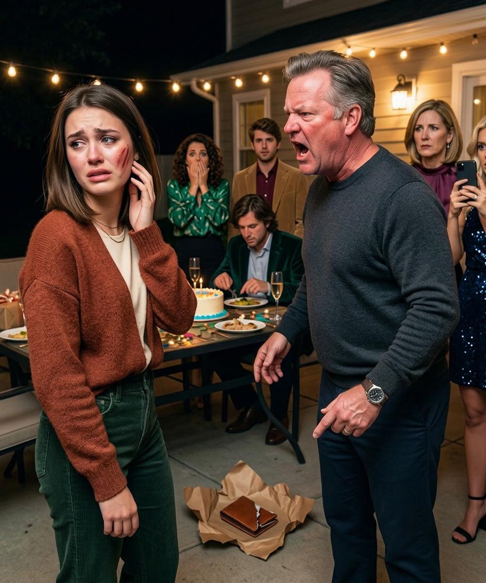 The sound cracked across the patio so sharply that every conversation stopped at once. One second I was standing there with the craft-paper package still half-open in his hand, and the next my face was burning, my head turned sideways, and a champagne glass had slipped from someone’s grip and shattered against the flagstones near my shoes.